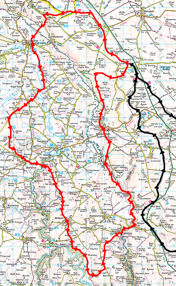 Route shown in red. Black line is part of the White Peak Marathon route. The DDD goes anticlockwise from Hartington – which is about half way up the eastern side of the red