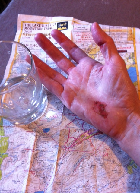 The next leg along the NW of Greenside was lovely and an area I’d never been to before. Great running, nice and bouncy, control in a ghyll, got there 4hrs into the race and contoured across an expanse of tussock before picking up a path route to No 5 flanking around the head of Glencoyndale, again somewhere I’d never been. I was running in dob spikes and must have caught on a rock as I fell flat on the scree to the side of the path, winded myself and gashed my right hand. I lay whimpering for a minute or so then got up and walked on, later getting back into a cautious jog. At least the control was quite easy as I was well and truly knackered now!